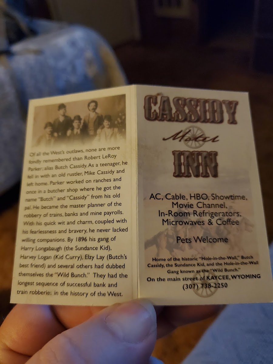 Perfect motel at a *great* rate. Old but charming and extremely clean. My tire exploded outside of Kaycee and I spent three hours on the interstate. When I called the Cassidy Inn extremely late they were up to meet me when I arrived. What a homie